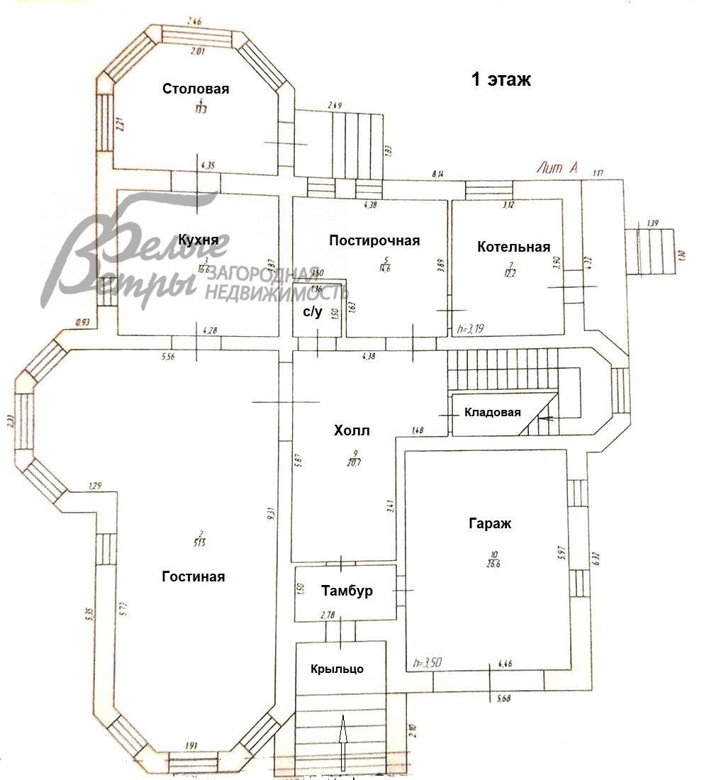 1-ый этаж: кухня-столовая, гостиная c мраморным камином, гостевой санузел, котельная с постирочной, кладовая, гараж на 1 м/м