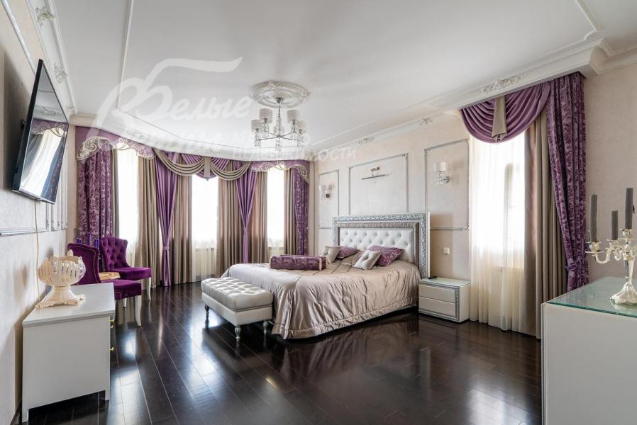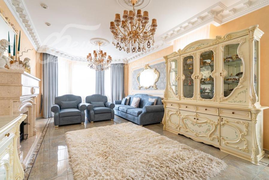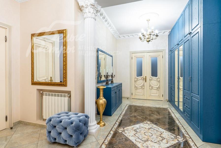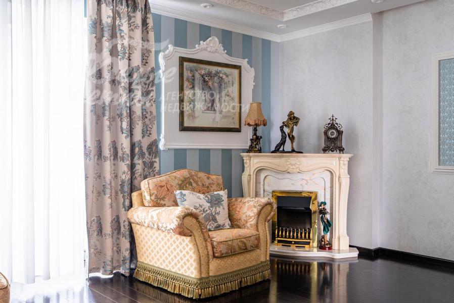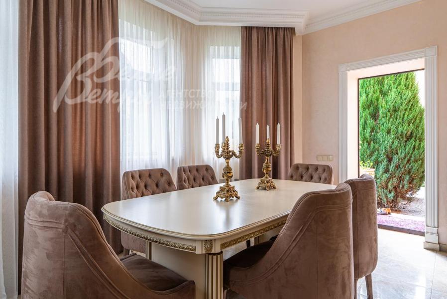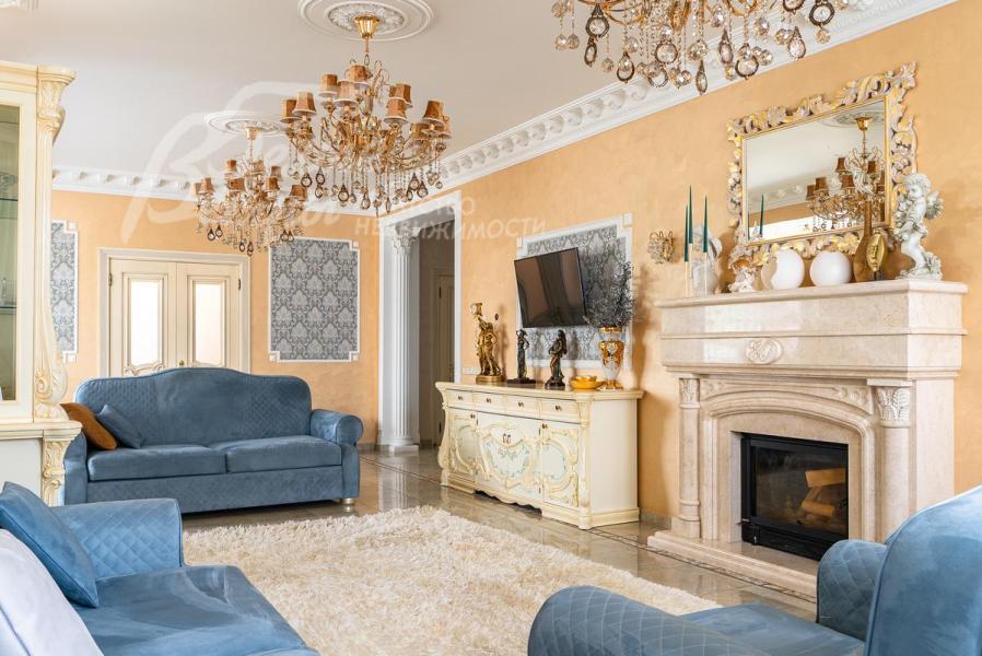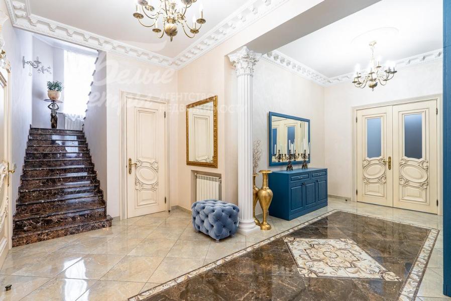 Описание внутренней отделки: Дом в классическом стиле построен по индивидуальному проекту с эркерами и балконом. Стены покрашены венецианской штукатуркой. Гостиную украшает натуральная лепнина ручной работы в классическом стиле. В доме полы с подогревом, выложенные паркетом и плиткой испанской марки Constanza. Коллекционные шторы из бархата и шелка. Деревянные барочные двери с резьбой ручной работы. Мраморная лестница.