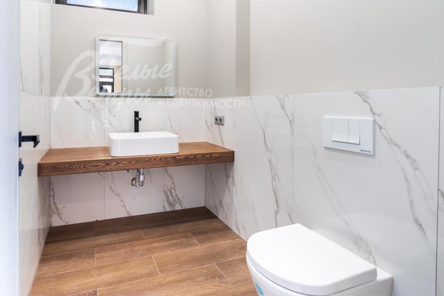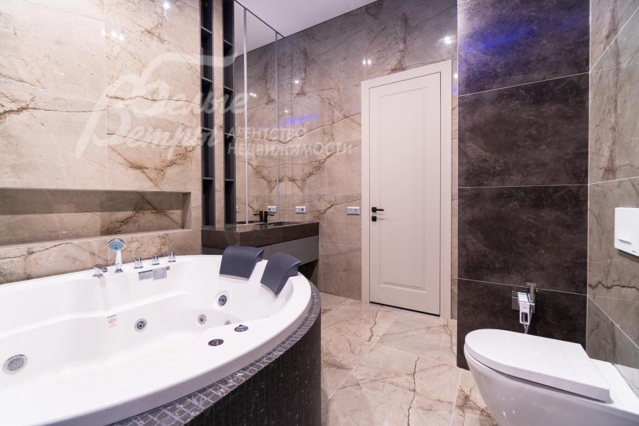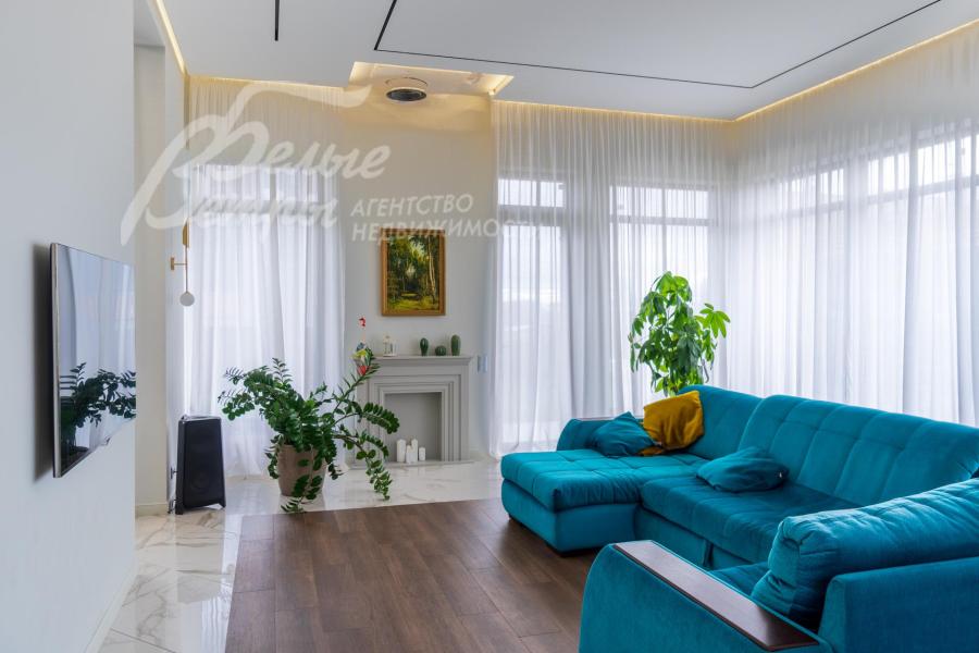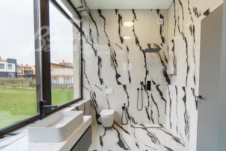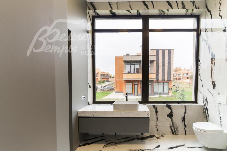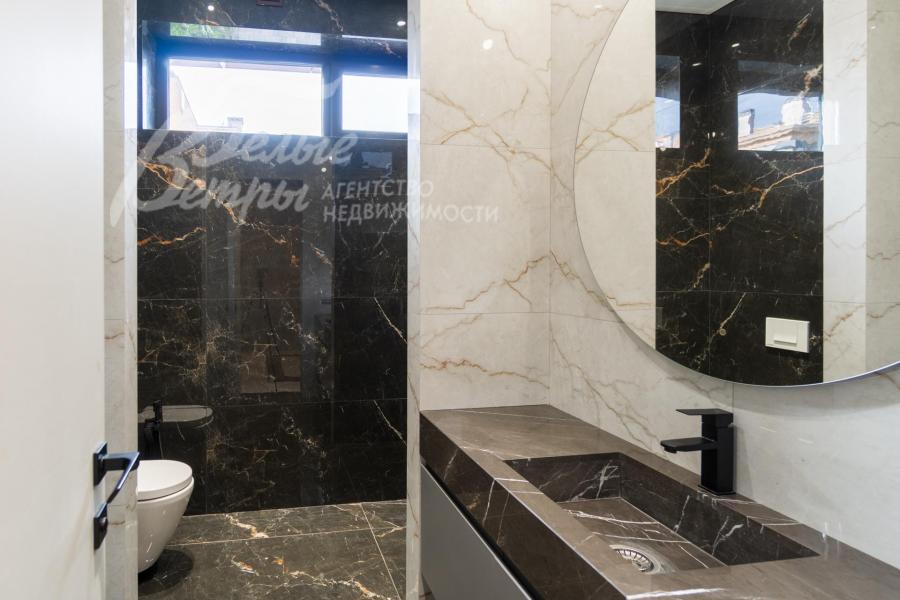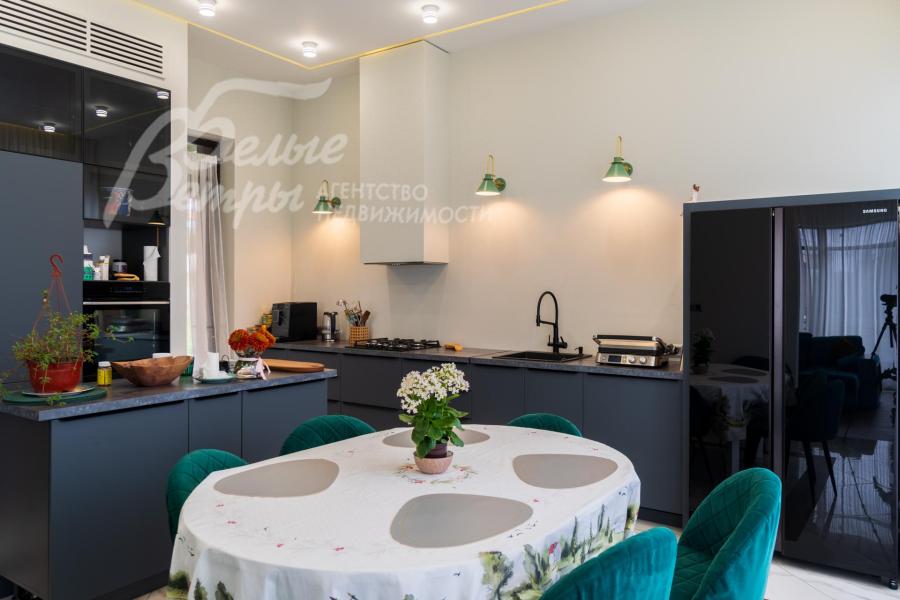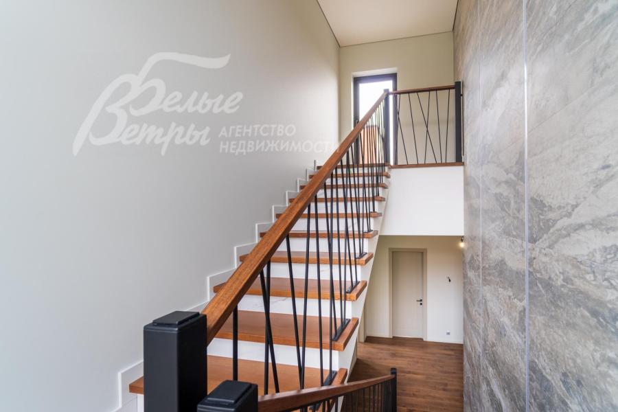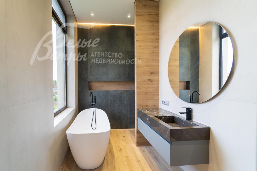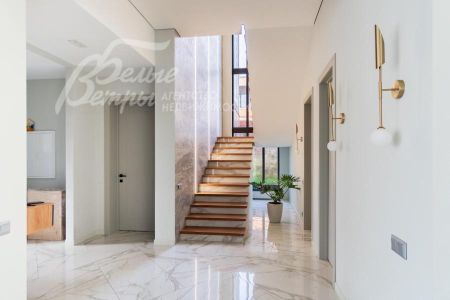 Описание внутренней отделки: Дизайнерская отделка в стиле Современный Модерн. На стенах декоративная штукатурка, окраска, в санузлах - плитка Laparet. В отделке использованы дизайнерские элементы из дерева, 3D элементы, различные ниши со скрытой подсветкой, зеркала и т.д. На полу керамогранит с водяным подогревом (все санузлы, прихожая, холл, зона кухни и зона гостиной); паркетная дубовая доска - все спальни и холл второго этажа. Потолки подвесные ГКЛ разноуровневые и натяжные (французские) с дизайнерскими элементами и различной подсветкой (скрытая светодиодная, точечные споты, движущиеся споты на рейлингах, люстры). Вся сантехника от ведущих брендов. Душевые со встроенной системой слива в пол и со стеклянными дверцами. Все коммуникации разведены, конвекторы встроенные польные, электрика АВВ (Германия). Двери деревянные эмалированные и двери скрытого монтажа высотой 2.3 м, подоконники из массива ореха.