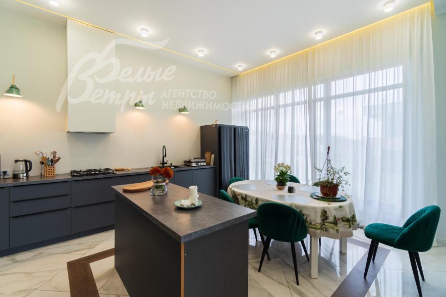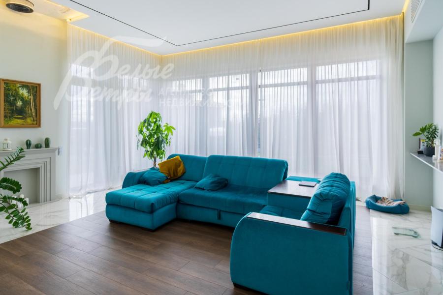 Мебель, оборудование: кухонный гарнитур с островом, эмалированные фасады из МДФ, столешница из искусственного камня. Вся необходимая встроенная техника: газовая варочная панель, духовой шкаф, двухдверный холодильник Side-by-Side, посудомоечная машина, стиральная машина, в гостиной большой современный телевизор. В столовой обеденная группа на 6 персон с мягкими креслами, в гостиной П-образный раскладной диван с обивкой из велюра. Возможно будет дополнить мебель под арендатора. В гостиной панорамное остекление закрыто тюлем. Установлена скрытая светодиодная подсветка, точечные споты, движущиеся споты на рейлингах, люстры.