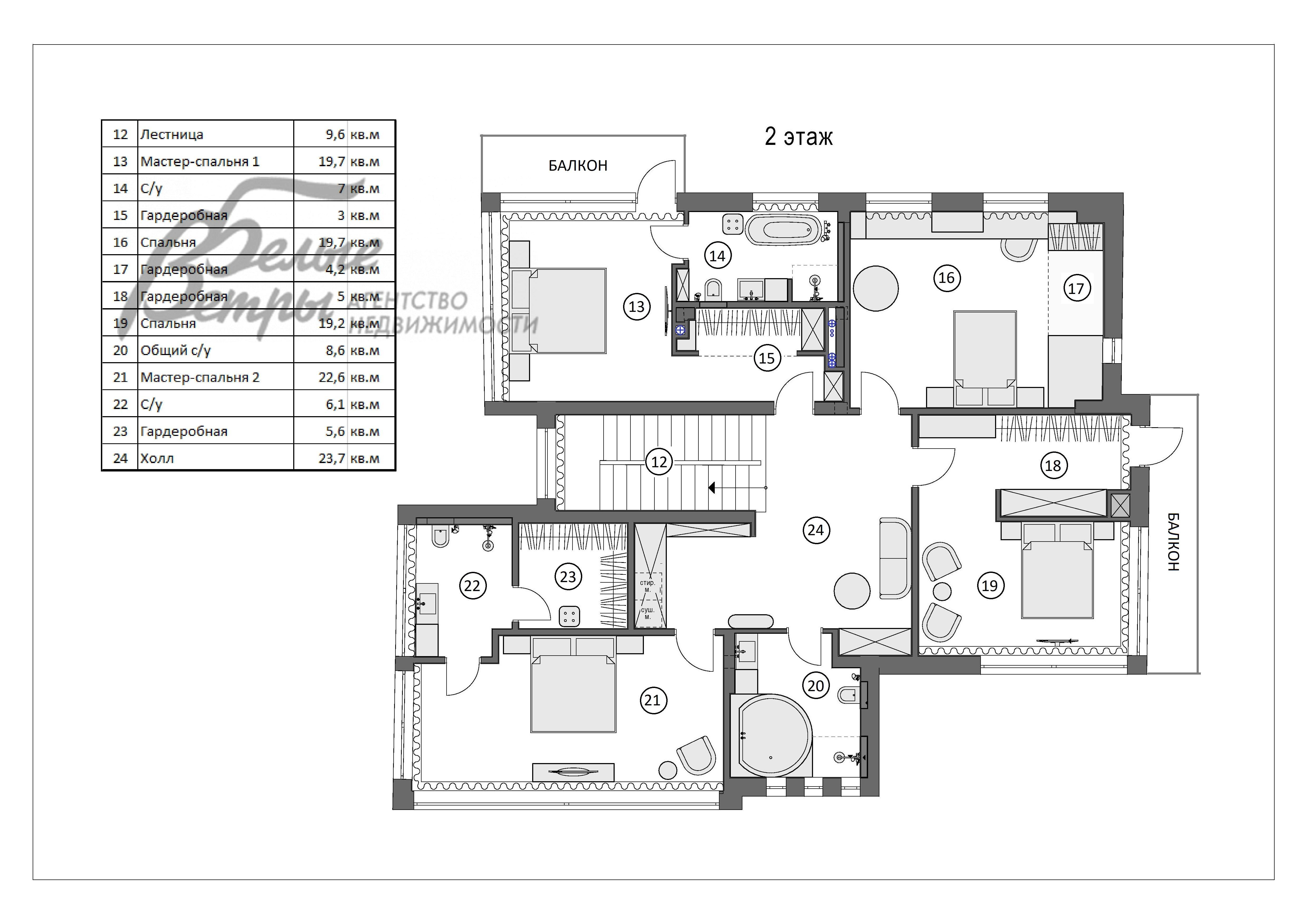 2-ой этаж: холл 24 кв.м, спальня 20 кв.м с гардеробной 4 кв.м, спальня 19 кв.м с гардеробной 5 кв.м с выходом на балкон, общий санузел 9 кв.м (душ и ванная), мастер-спальня 23 кв.м с санузлом 6 кв.м (душ) и с гардеробной 6 кв.м, мастер-спальня 20 кв.м с санузлом 7 кв.м (душ и ванная) с гардеробной 3 кв.м и с выходом на балкон.