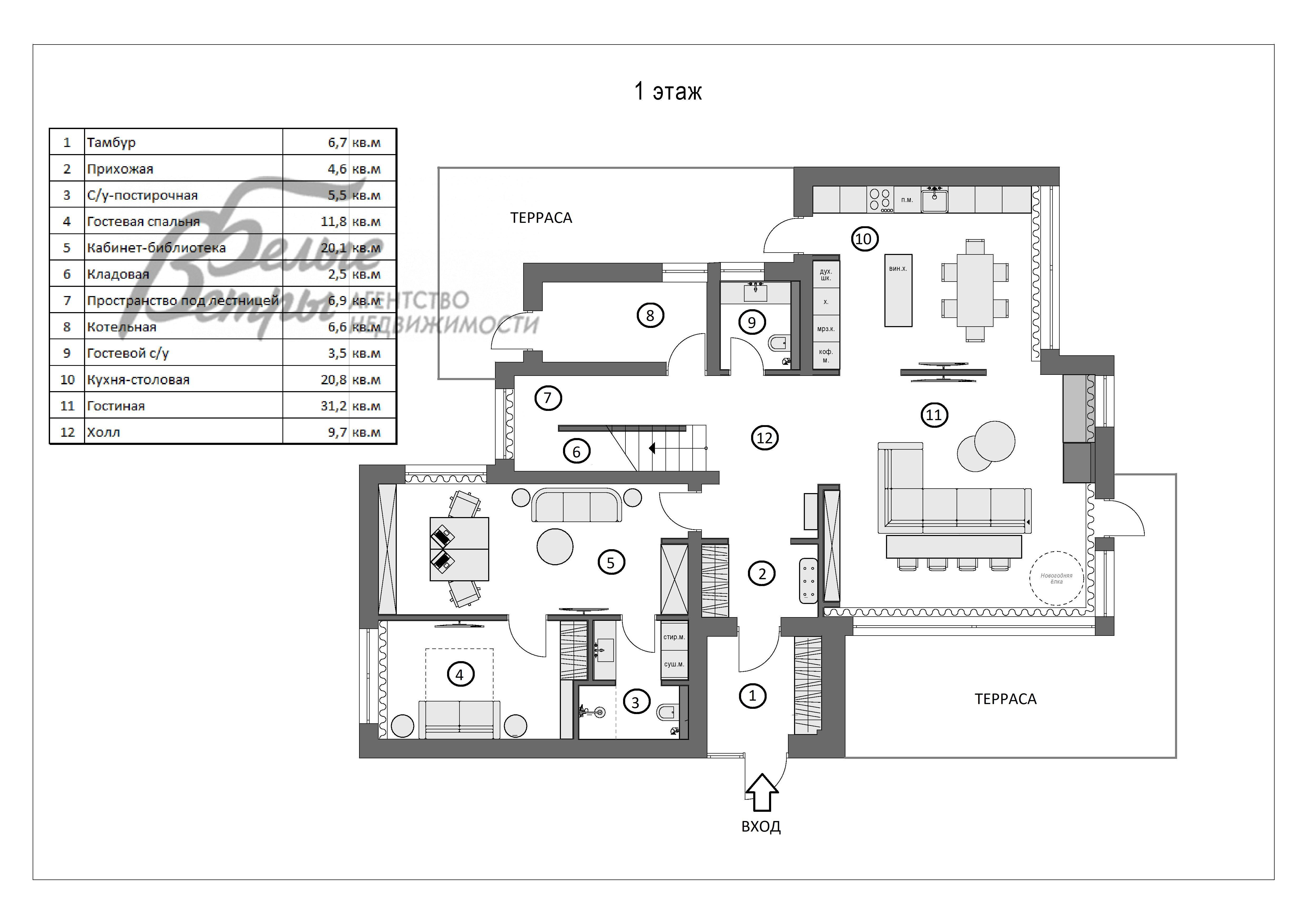 1-ый этаж: тамбур 7 кв.м, прихожая 5 кв.м, холл 10 кв.м, зона гостиной 31 кв.м с выходом на террасу, зона кухни-столовой 21 кв.м с выходом на террасу, кабинет-библиотека 20 кв.м, гостевая спальня 12 кв.м, санузел-постирочная 6 кв.м с душевой, кладовая 3 кв.м, пространство под лестницей 7 кв.м, общий санузел (1/2) 4 кв.м, котельная 7 кв.м с отдельным входом.