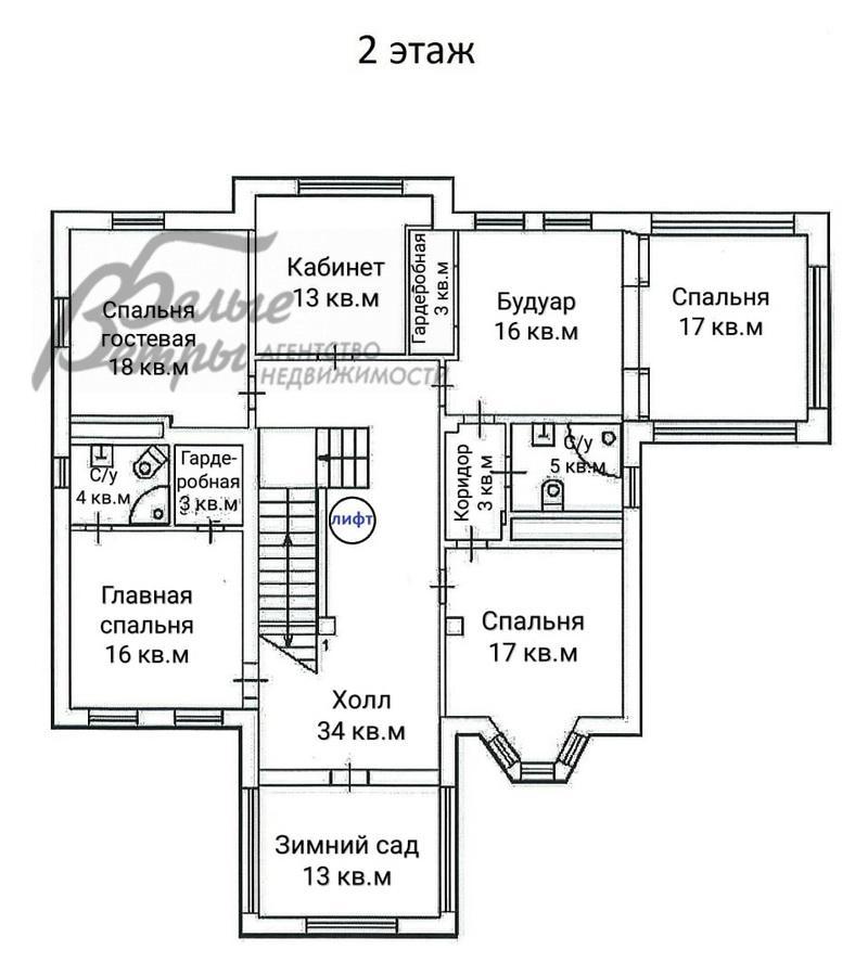 2-ой этаж: холл 34 кв.м с лифтом и зимним садом 13 кв.м, главная спальня (мужская) 16 кв.м с санузлом 4 кв.м (душевая) и с гардеробной 3 кв.м, гостевая спальня 18 кв.м, кабинет 13 кв.м, спальня (женская) 17 кв.м с будуаром 16 кв.м с гардеробной 3 кв.м с санузлом 5 кв.м (душевая), спальня 17 кв.м;