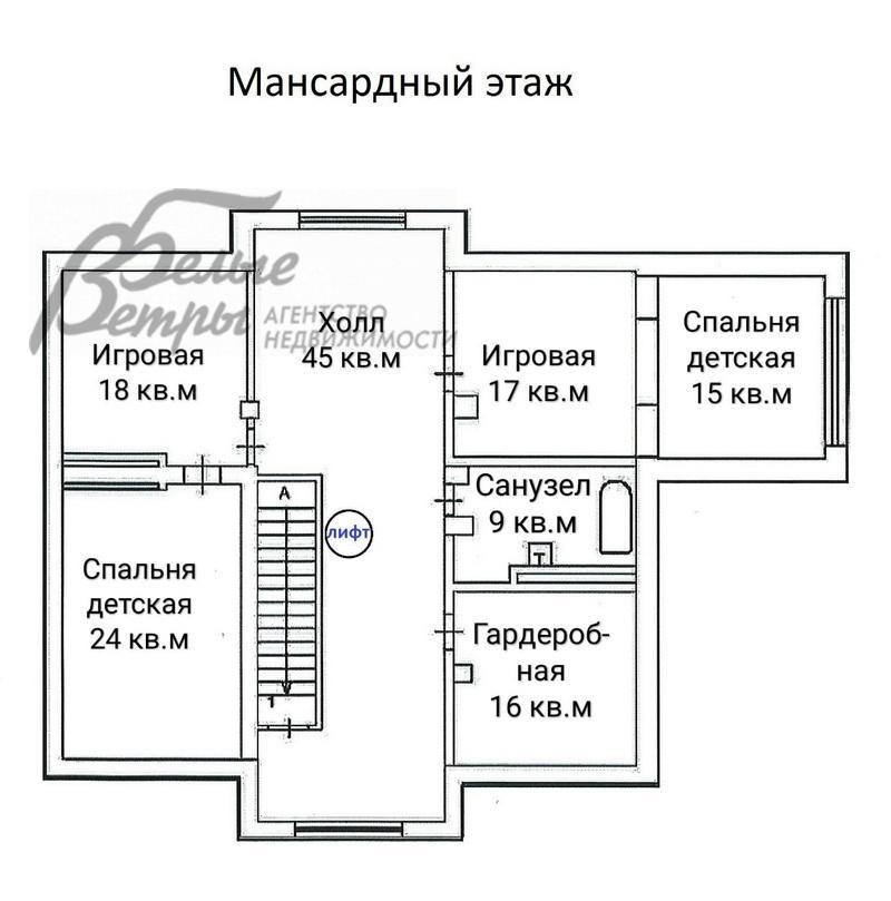3-ий этаж: холл 45 кв.м с лифтом, детская спальня 24 кв.м с игровой комнатой 18 кв.м, детская спальня 15 кв.м с игровой комнатой 17 кв.м, общий санузел 9 кв.м с ванной, гардеробная 16 кв.м.