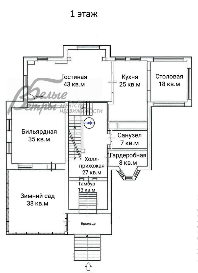 1-ый этаж: гостиная 43 кв.м с камином, кухня 25 кв.м, столовая 18 кв.м, гостевой санузел 7 кв.м, зимний сад 38 кв.м, бильярдная 35 кв.м, холл-прихожая 27 кв.м с лифтом и с гардеробной 8 кв.м, тамбур 13 кв.м, крыльцо;