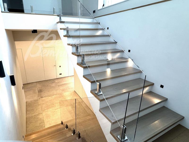 Описание внутренней отделки: в доме выполнена стильная современная отделка под ключ с использованием элитных материалов. Стены оштукатурены, окрашены матовой моющейся краской Sherwin-Williams (США). На полу в жилых комнатах - инженерная дубовая доска LuxuryTree, Дуб Кавказский, Селект-Прайм, покрытая матовым лаком Silver Grey, на кухне и в санузлах – крупноформатный ректифицированный керамогранит PORCELANOSA (Испания) и керамогранит ITALON (Италия). Установлены внутрипольные конвекторы с эффектными деревянными решетками. Потолки отделаны гипсокартоном на профиле, окрашены. Установлен биокамин LuxFire (Россия), выполнено качественное встроенное и трековое освещение (Стильный Свет, Россия). На второй этаж ведёт широкая удобная монолитная лестница, ступени из инженерной доски со шпоном дуба, ограждение из закаленного осветленного стекла (Crystalvision - Япония). Установлены двери современного дизайна скрытого монтажа, окрашенные в цвет стен, подоконники из кварцевого агломерата, розетки и выключатели EFAPEL (Португалия)