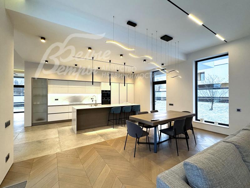 Стильный новый дом под ключ! 333 кв.м в духе архитектуры хай-тек в коттеджном поселке премиум класса Райт Вилладж. Дом с несущим монолитным каркасом, заполненным кирпичом, панорамным остеклением, высокими потолками готов к заселению: отделан элитными материалами, обставлен европейской мебелью. Функциональная планировка включает в себя: единое пространство кухня-столовая-гостиная, 5 спален, одна из которых на 1-м этаже, 5 санузлов, террасы. Установлен биокамин, сделано качественное трековое и встроенное освещение. Участок 16 соток с ландшафтным дизайном, плодовыми и декоративными деревьями, большой солнечной поляной. Элитный коттеджный посёлок, выстроенный в едином стиле, со всеми центральными коммуникациями, строгой охраной, инфраструктурой городского типа и великолепными природными пейзажами. В поселке открыт ресторан ПРЕРИЯ, супермаркет, аптека, есть прогулочные зоны с водоемом и фонтанами, спортивные площадки, в ближайшее время будет открыт детский сад Stay and Play. В поселке началось строительство большого спортивного комплекса (фитнес клуб с бассейном, площадки для футбола/баскетбола, пляжного волейбола, катка)