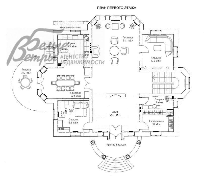 1-ый этаж: прихожая, холл 25,7 кв.м, кухня 15,5 кв.м, столовая 22,1 кв.м с выходом на террасу 31,2 кв.м, двухсветная гостиная 54,1 кв.м, гардероб 10 кв.м, санузел 7 кв.м, спальня 15,6 кв.м, спальня 17,7 кв.м, лестница 4,6 кв.м.