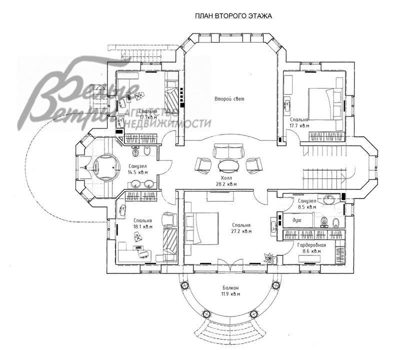 2-ой этаж: холл-галерея над вторым светом 28,2 кв.м, мастер-спальня 27,2 кв.м с санузлом 8,5 кв.м и гардеробной 8,6 кв.м и балконом 11,9 кв.м, спальня 17,7 кв.м, спальня 17,7 кв.м, спальня 18,1 кв.м, санузел 14,5 кв.м.