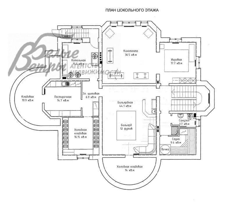 Цоколь: котельная 15,5 кв.м, кинотеатр 36,5 кв.м + игровая 17,7 кв.м, бильярдная 44,1 кв.м, сауна с бочкой 9,4 кв.м, душевой 3,7 кв.м и санузлом 3,6 кв.м, постирочная 14,7 кв.м с кладовой 19,9 кв.м, электрощитовая 6,9 кв.м, холодная кладовая 16,15 кв.м, холодная кладовая 14 кв.м.