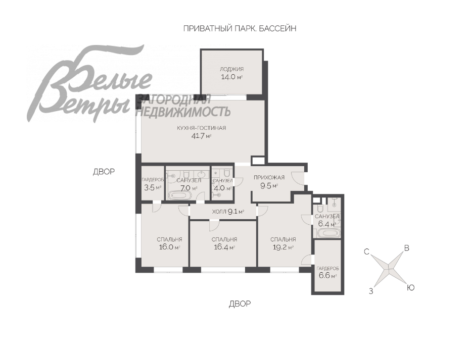 Комнат: 4 (предполагаемая планировка: прихожая 9.5 кв.м, кухня-гостиная 41.7 кв.м с выходом на лоджию 14 кв.м с видом на приватный парк с бассейном; мастер-спальня 19.2 кв.м с санузлом с ванной и душевой кабиной 6.4 кв.м и гардеробной 6.6 кв.м; спальня 16.1 кв.м с гардеробной 3.5 кв.м, спальня/кабинет/детская 16.4 кв.м; общий санузел с ванной и душевой кабиной 7 кв.м, общий санузел 4 кв.м.)