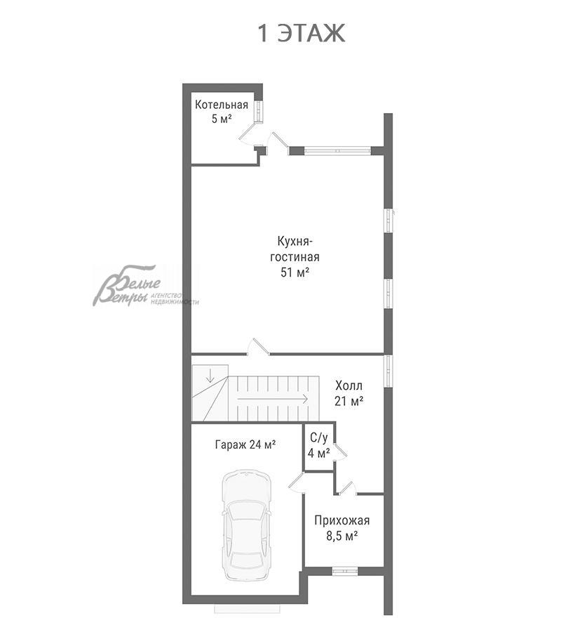 1-ый этаж: прихожая 8,5 кв.м, холл 21 кв.м, кухня-гостиная 51 кв.м, санузел 4 кв.м, котельная 5 кв.м, гараж 24 кв.м