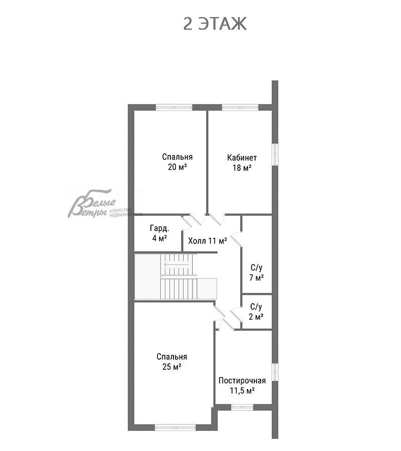 2-ой этаж: холл 11 кв.м, спальня 25 кв.м, спальня 20 кв.м, кабинет 18 кв.м, гардеробная 4 кв.м, санузел 7 кв.м, санузел 2 кв.м, постирочная 11,5 кв.м